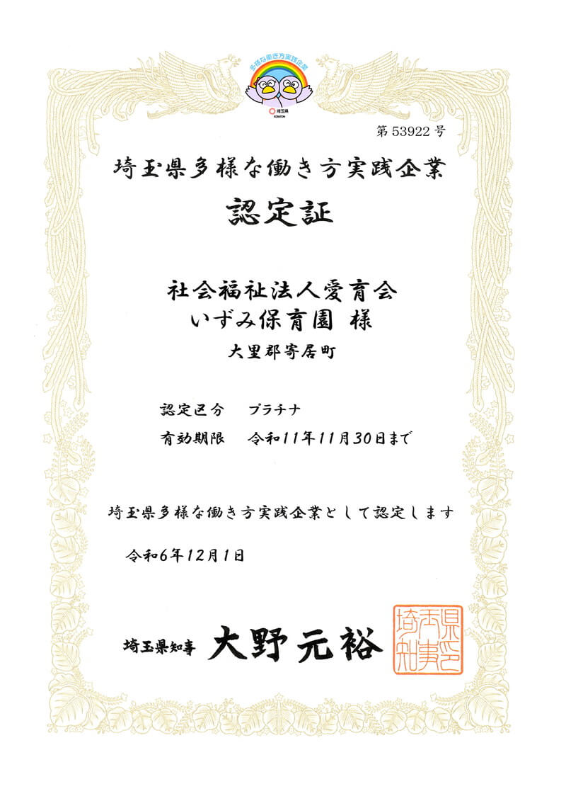 埼玉県多様な働き方実践企業最高ランク(プラチナ)に認定